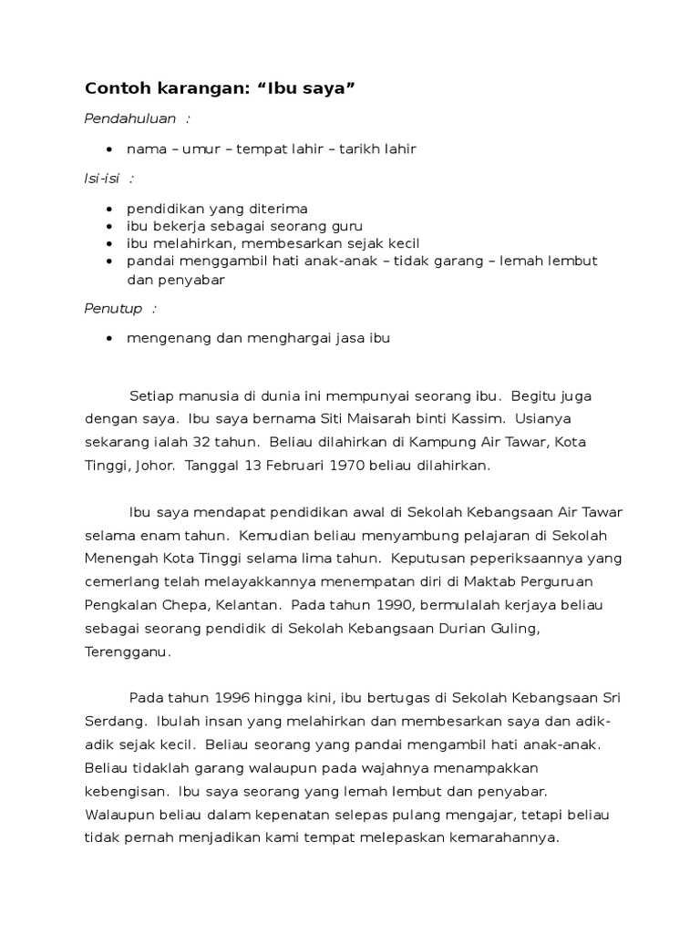 Sungguh saya merasa sangat terharu dapat menyaksikan kembali, buku karya ayah saya, yang sudah 40 tahun tidak dapat saya lihat lagi. Adik perempuan saya bernama fatimah, ia belajar di sdn 1 bandung kelas empat. Beliau dilahirkan di kampung air tawar, kota tinggi, johor. Tanggal 13 februari 1970 beliau dilahirkan. Sebagai ketua keluarga, ayah saya telah membeli sebuah rumah yang indah sebagai tempat perlindungan kami sekeluarga. Karangan jenis biografi diedit thn 4. Lalu, pada tahun 1993, lahirlah kakak saya atau putri pertama ayah dan ibu saya, yang bernama nursyifa kamilia. Merupakan anak sulung dalam keluarga. Pada pukul 7:00 malam,kami pun pulang. Saya amat berterima kasih kepada bapa saya kerana memberi saya sebuah kehidupan yang bahagia. Pada tahun ini, beliau berumur 40 tahun. Ayah saya ialah seorang kakitangan kerajaan yang bekerja di sebuah hospital di kota bharu. Pada hari tersebut, ayah dan abang sibuk menghias ruang tamu dengan belon dan reben yang beraneka warna.