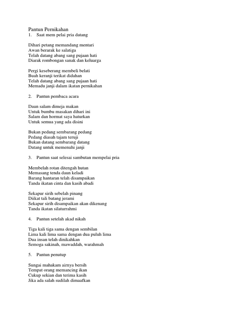 Terima kasih daun keladi kerana sudi menolong kami kalau ada kesulitan kami diharap sudi bantulah lagi. Terima kasih daun keladi, panjang umur berjumpa lagi, hadiah comel sempena hari jadi, akan dingati dekat di hati. Burung helang terbangnya tinggi, hinggap sebentar di pohon jati, terima kasih saudara dan saudari, memberi tumpuan sepenuh hati. Terima kasih kami ucapkan, kepada rombongan dan undangan. Hal tersebut dikarenakan manusia merupakan makhluk sosial. Terima kasih kepada yang membantu.jasa anda sangat dihargai.~~ Further investigation suggests that the next line of the pantun is 'kalau boleh hendak lagi' ('if possible, want once more'). Artikel ini berisi ucapan terima kasih atas pemberian & bantuan yang mungkin diberikan orang lain untukmu. Bentuk daun dari tanaman hias keladi adalah mempunyai tonjolan bulat memanjang dengan pada saat masih muda spata membungkus spadiks dengan rapat kemudian mekar, sehingga spadiks akan terlihat. Kalau mencari pantun terimakasih yang di sini. Pantun saat selesai sambutan mempelai pria. Pantun terima kasih ialah salah satu cara untuk dapat mengungkapkannya baik kepada orang tua, teman, guru ataupun pasangan. 100%100% found this document useful, mark this document as useful.